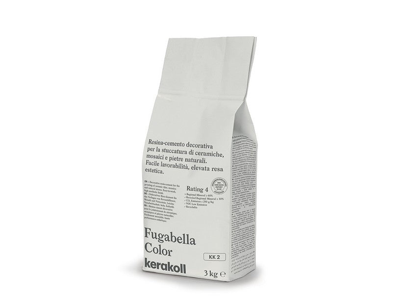 Descrizione: Resina-cemento® decorativa per la stuccatura di piastrelle, mosaici e marmi in 50 colori di design. Fugabella® Color è il rivoluzionario stucco ibrido per decorare qualunque superficie in grès porcellanato, mosaico e pietre naturali. Fugabella® Color raggiunge caratteristiche di idrorepellenza, ridottissimo assorbimento d’acqua, alta durezza superficiale, elevata resistenza alle sostanze acide più comuni e totale uniformità del colore.