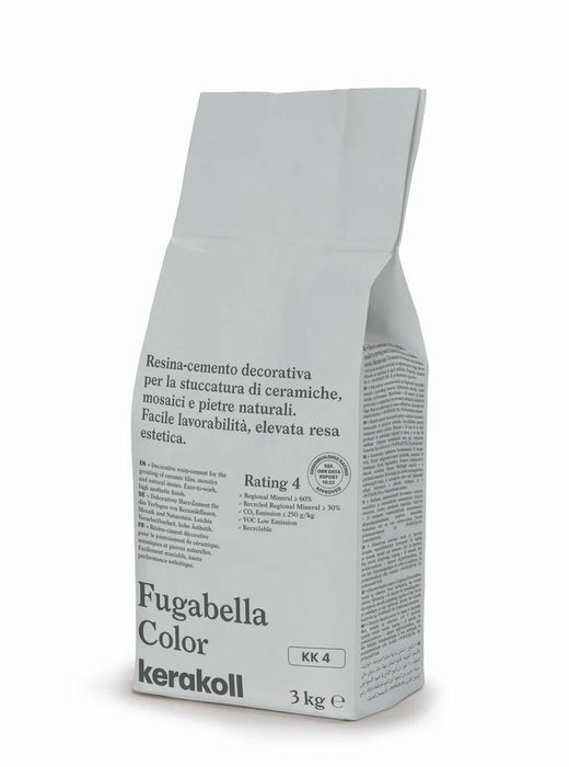 Descizione: Resina-cemento® decorativa per la stuccatura di piastrelle, mosaici e marmi in 50 colori di design. Fugabella Color KK è il rivoluzionario stucco ibrido per decorare qualunque superficie in grès porcellanato, mosaico e pietre naturali. Fugabella Color KK raggiunge caratteristiche di idrorepellenza, ridottissimo assorbimento d’acqua, alta durezza superficiale, elevata resistenza alle sostanze acide più comuni e totale uniformità del colore.