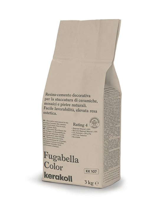 Descizione: Resina-cemento® decorativa per la stuccatura di piastrelle, mosaici e marmi in 50 colori di design. Fugabella Color KK è il rivoluzionario stucco ibrido per decorare qualunque superficie in grès porcellanato, mosaico e pietre naturali. Fugabella Color KK raggiunge caratteristiche di idrorepellenza, ridottissimo assorbimento d’acqua, alta durezza superficiale, elevata resistenza alle sostanze acide più comuni e totale uniformità del colore.